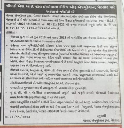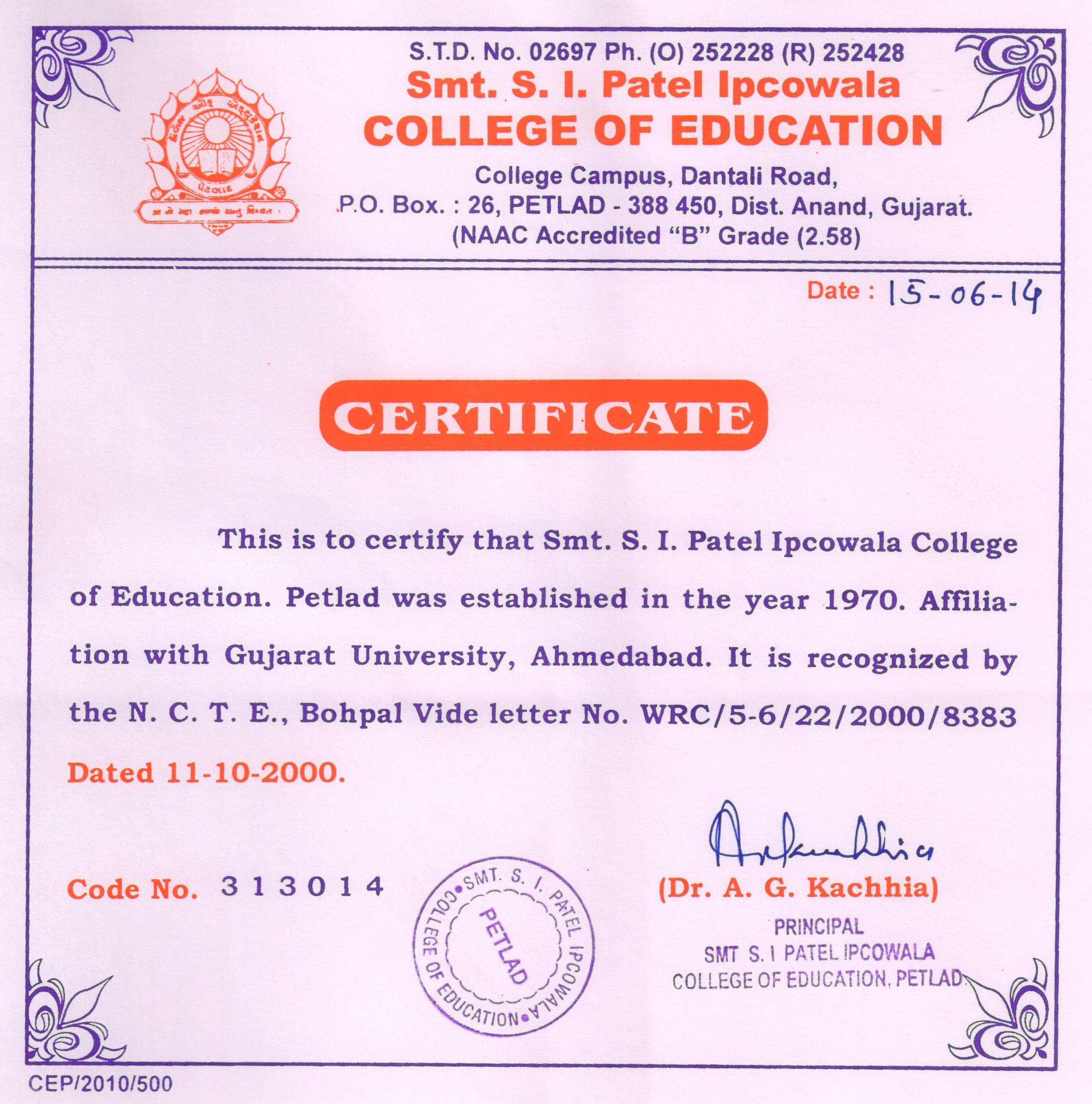 The college currently admits 50 students along with 5 seats of EWS students annually to its two-year Bachelor of Education (B.Ed.) programme, following the revised NCTE curriculum framework. It is a co-educational, grant-in-aid institution with permanent recognition from the Government of Gujarat, NCTE approval, and UGC registration under Sections 2(f) and 12(B). The college maintains permanent affiliation with Sardar Patel University, Vallabh Vidyanagar, one of the leading universities in Gujarat.